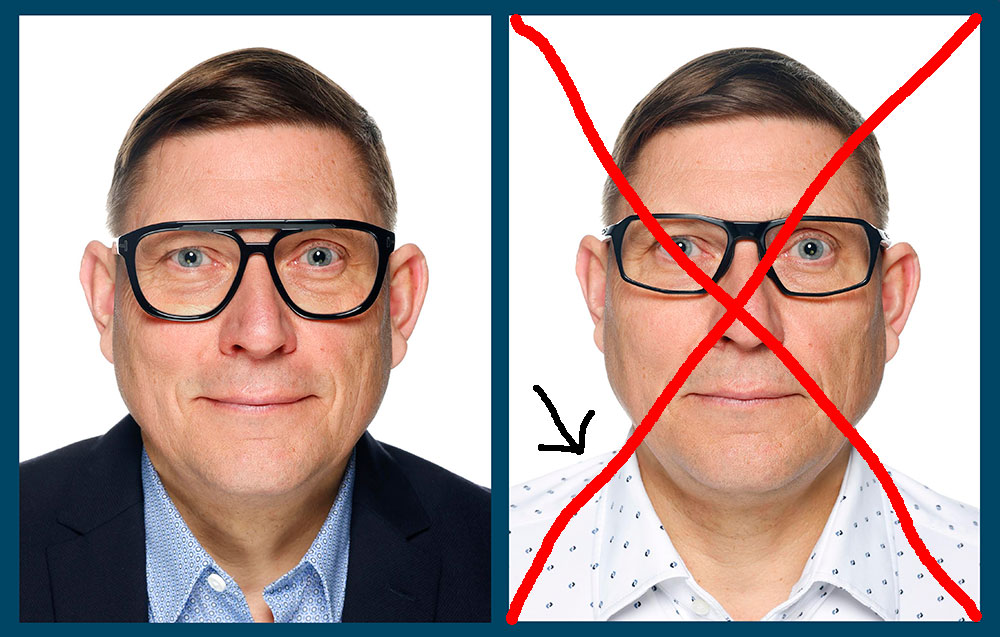 Bruger du briller, må der ikke være reflekser, og øjnene skal være tydeligt synlige. Briller med tonede eller farvede glas er ikke tilladt.